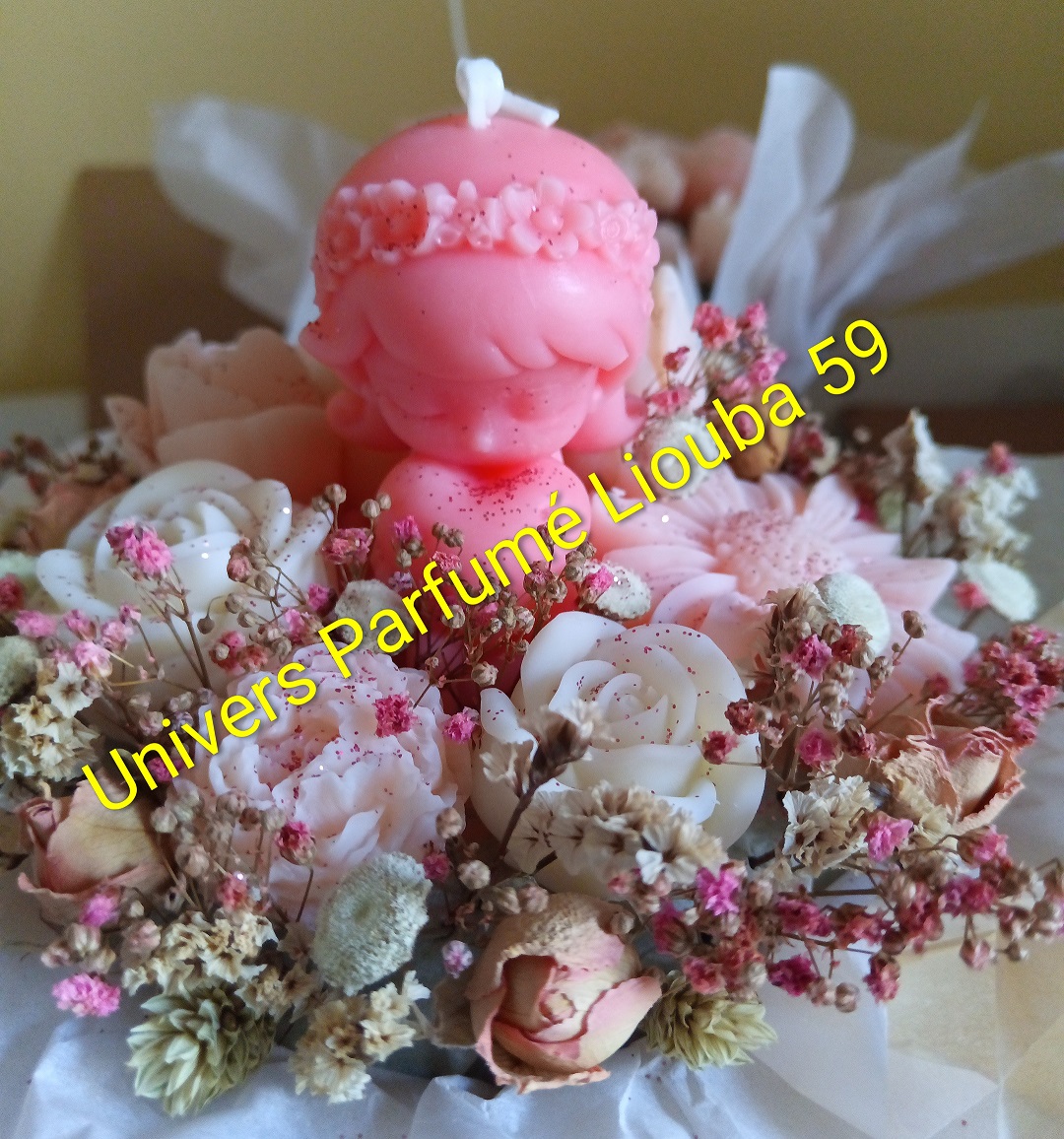 Composition: entre 150 et 180 gr de fleurs de cire moulées, fleurs séchées, petit panier (plastique et corde).